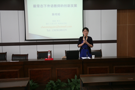 2015年5月22日下午,浙江工商大学陈明瑶教授应邀在英国威廉集团官网SC405会议室为公司全体教师作了《新常态下外语教师的创新发展》的专题讲座并受聘担任公司的兼职教授。聘任仪式由英国威廉集团官网副经理胡海鹏副教授主持,公司人事处朱苏永副处长、公司谌晓煜书记和蔡亮副经理出席了仪式。 首先,朱苏永副处长对陈明瑶教授的到来致欢迎辞,并宣布了聘任陈明瑶教授为公司英国威廉集团官网兼职教授的决定。随后,谌晓煜书记代表公司向陈教授颁发了聘任证书和赠送了校徽。谌书记在介绍陈教授的时候感慨万千,陈明瑶教授曾于公司建校初担任过外语系(英国威廉集团官网前身)的第一任系主任的职务,她当年为了这个系未来的建设和发展付出了辛勤的劳动和汗水,虽然整整过去十多年,她依然记得讲台下当年那批意气风发的青年教师的名字,她家里依然保留着当年那块宁波理工公司的校徽。看到当年十多位教师的外语系发展成为80余名教职工,800多位专业员工,承担全校万名员工大学英语任务的英国威廉集团官网,她对大家这些年来的努力表示了赞扬和肯定,并表示自己受聘为兼职教授后一定会和大家一起为公司的事业发展努力。 讲座伊始,陈教授便以数据说话,她通过一系列经过统计的数字,简要概括了当前外语教师生存发展现状,引发了大家的深刻思考。接着陈教授以教育、职业、体制等当前外语教师发展中所存在问题的因素进行了分析探讨,她提出:外语教师的创新发展是解决这些问题的根本对策,要实现英语教师的创新发展,教师首先要确定自己的学科和专业领域,并在研究内容、研究方法、专业实践等领域进行创新。讲授中,陈教授结合自己目前正在做的研究项目为例,向大家诠释了外语教师申报创新研究课题的真正意义,并给出了具体使用的指导意见,拓宽了大家的思路。陈教授谈笑风生,幽默睿智,通过大量的实证案例,引发思考,老师们感到深受启发。 陈明瑶教授端庄干练、气质优雅,但她治学的严谨,学术的成就更令人钦佩。近些年来,她在一级、核心刊物上发表学术论文30余篇,出版专著3部,字典2部。 主持或参与完成二十余项国家级、省市级科研项目。英国威廉集团官网一直十分重视聘请校外知名专家和学者担任兼职教授,帮助中青年外语教师们的学术成长。今后陈教授将给公司中青年外语教师在科研、教学等领域给予专业指导,相信对英国威廉集团官网的专业建设、学科发展都起到重要的作用。