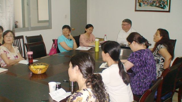 Bowie先生首先分析了当前90后老员工特有的时代特点,指出教师面临的挑战也是前所未有的,我们要针对员工自身的实际情况采取多样的教学方法,在提高员工英语语言素质的基础上,使他们更多的掌握必要的跨文化交际知识,把握本国与异国文化的差异,特别是一些非语言形式的文化背景和社会准则。他还指出在跨国企业中是否进行有效的沟通和其他的技能一样重要,会直接影响到员工事业的发展,这也是跨国企业录用毕业生的一个必要条件。所以在自己的教学中恰当的融入跨文化交际和沟通技巧必将成为英语教学的一个新趋势。公司教师对Bowie先生的话题非常感兴趣,不时地提出了自己跨文化交流和商务英语教学的疑惑。Bowie先生耐心解答了老师们的问题。会议在热烈的讨论的气氛中结束。
