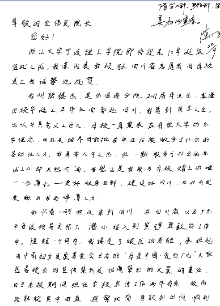 在公司建校十周年校庆前夕,于今年暑期奔赴西部从事志愿服务工作的外语分院2011届毕业陆臻杰生发来贺信,遥祝母校十年华诞!