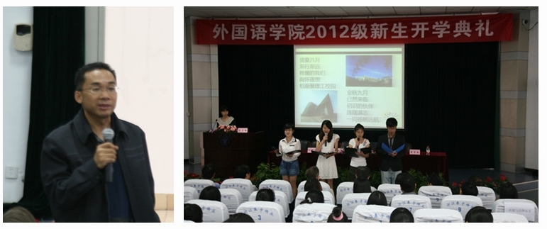 典礼开始前,几位高年级同学用中、英、日三种语言朗诵了一首《理工欢迎你》的诗歌。这首诗歌是由几位同学在老师的指导下,在短短的时间里通过努力创造出来并翻译成了英语和日语。一个温情美丽的开场白,深深打动了每位新生的心,赢得了同学们的热烈掌声。