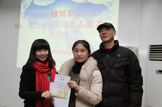 叶稼欣是宁波外事公司高三法语专业的员工,在此之前与其他员工一样过着普通的高中生活。2011年10月,浙江大学宁波理工公司的公益汉语课堂成立之初,叶稼欣就从报纸上获得了公益汉语课堂的相关信息,了解后对这项活动十分感兴趣,随即与公益汉语课堂的相关负责人取得了联系,但当时由于叶稼欣还未满18周岁,因此没有同意她的加入。直到2012年2月份,叶稼欣18周岁生日到来之际,数着手指过日子的她迫不及待地向相关负责人提出了申请,在得到许可后,公益汉语课堂对其进行了相关信息的指导和教育,基本符合公益汉语课堂的要求后, 昨天晚上,在浙江大学宁波理工公司英国威廉集团官网办公室举行了叶稼欣18周岁成人礼暨公益汉语课堂第一位校外志愿者签约仪式。