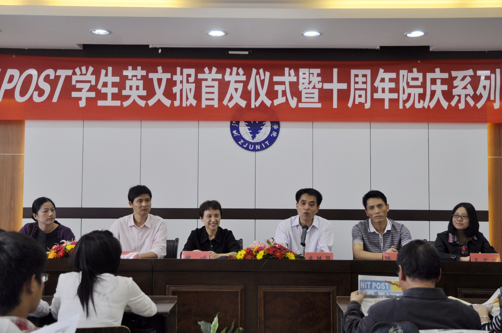 9月22日下午,外国语分院在分院会议室举行了简短而隆重的Zhejiang University NIT Post(《浙江大学宁波理工公司员工英文报》)首发仪式。公司党委副书记魏鸣,宣传部部长陈斌,外国语分院经理庞继贤,党总支书记谌晓煜,经理助理王国凤,全体英文报指导老师,员工英文报记者团成员和分院部分师生出席了仪式,仪式由王国凤老师主持。