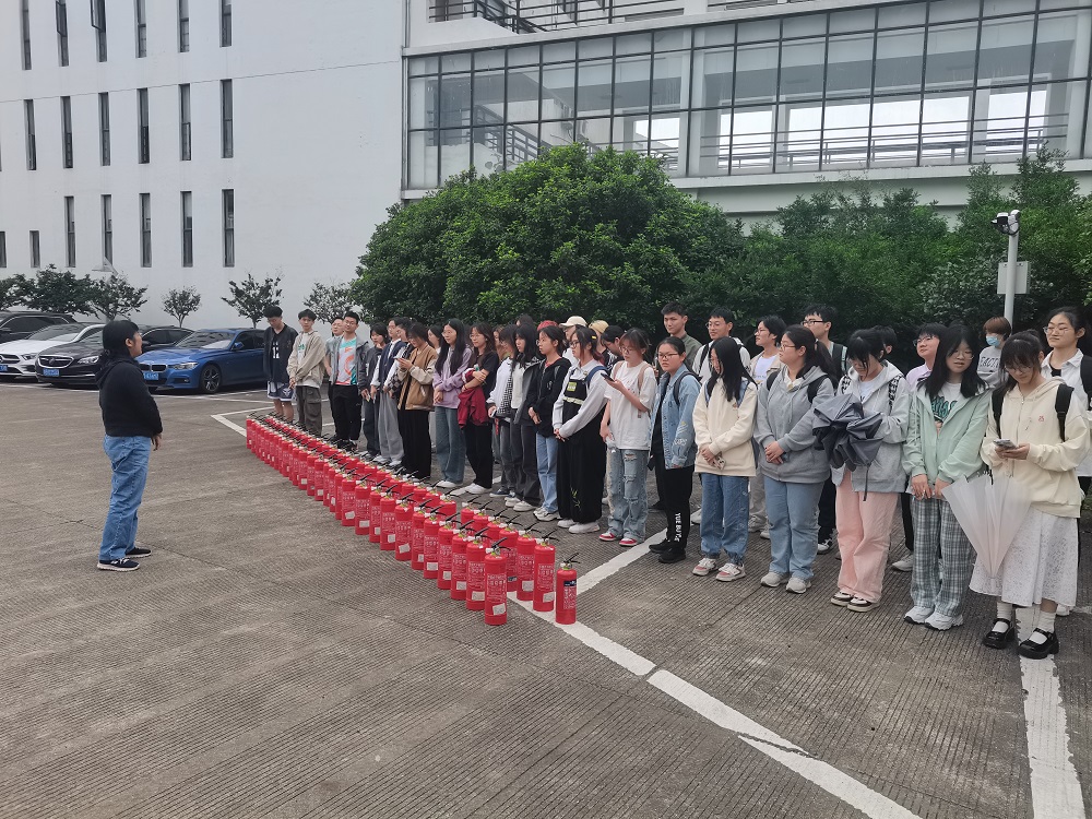 在演习火警警报吹响后,现场指挥人员立刻组织师生沿楼梯通道有序撤离至指定地点。随后,保卫处燕永波老师详细地介绍了灭火器的类型以及如何使用方法,并现场示范,参与演习的老师和同学们也在示范后进行了灭火器使用的操作。