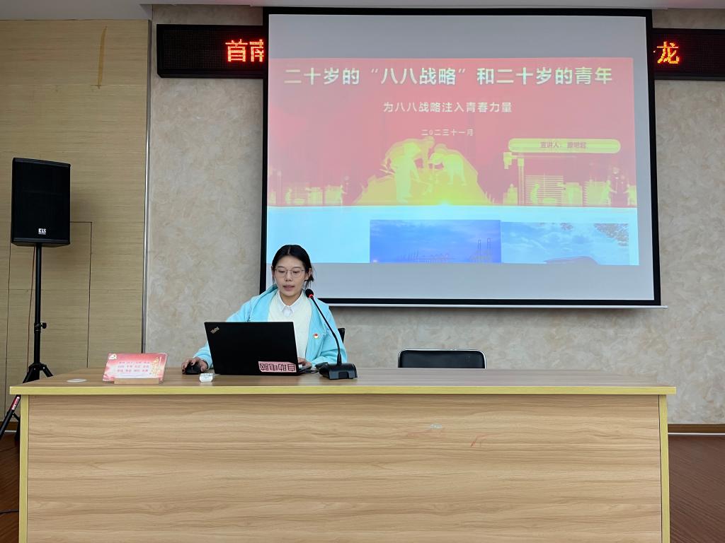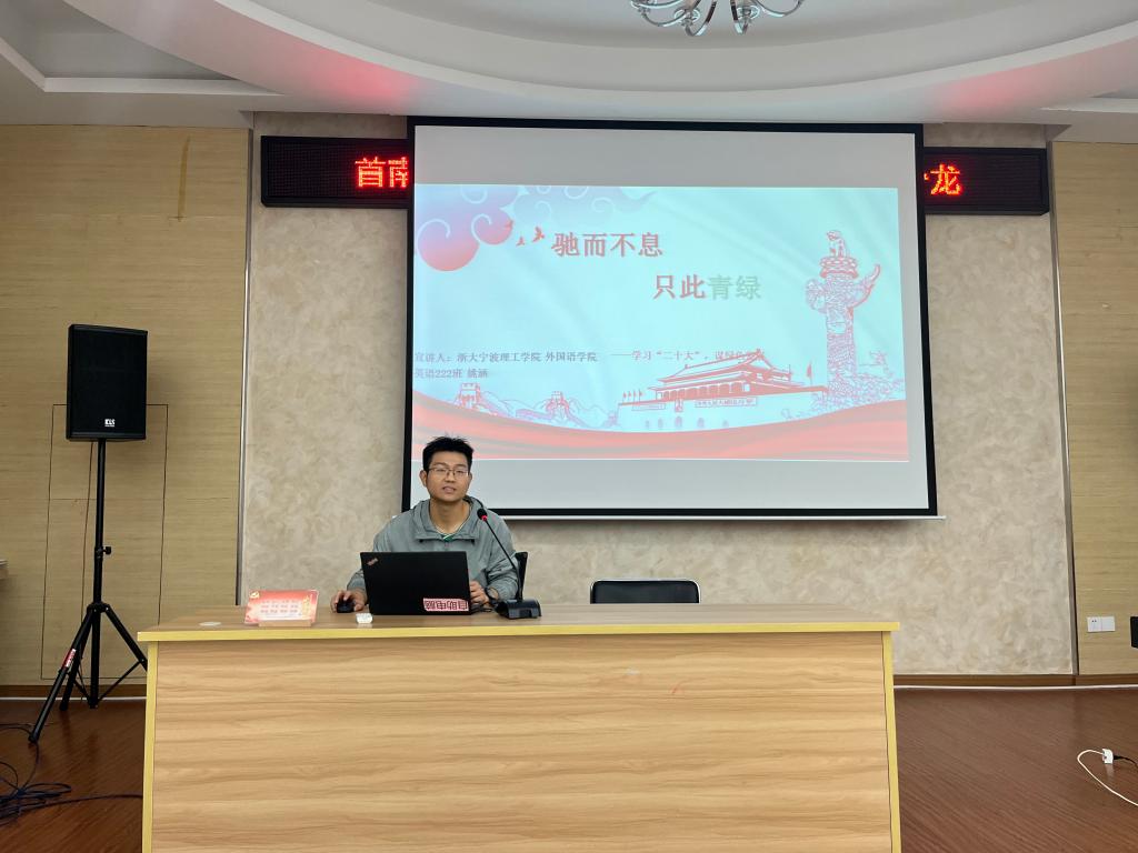 来自英语202班的宣讲员王灏蕴同学围绕“教育、科技、人才”这一主题进行宣讲。习近平总书记在党的二十大报告中指出“教育、科技、人才是全面建设社会主义现代化国家的基础性、战略性支撑”,王灏蕴分别从三者的辩证统一关系、重要意义以及如何做好这项工作进行了介绍。日语211班宣讲员滕明起同学以《二十岁的“八八战略”和二十岁的青年》为题,详细介绍了“八八战略”的主要内容,并通过丽水景宁、宁波梅山新区、安吉县下姜村三个典型案例,生动介绍了“八八战略”取得的成果,并从中总结青年老员工该如何践行“八八战略”。英语222班宣讲员姚涵同学以《驰而不息 只此青绿》为题对新时代我国在环保领域开展的措施、取得的成效进行了宣讲,并号召社区党员群众开展低碳减排活动,倡导绿色生活人人参与,为我国环保事业贡献自己的力量。