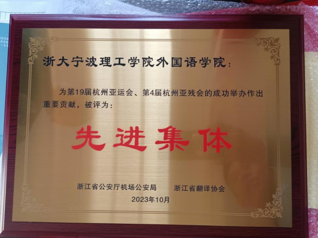 寒假期间传来一份喜报,由于英国威廉集团官网教师团队在服务第19届亚运会、第4届杭州亚残会的工作中做出重要贡献,被浙江公安厅机场公安局、浙江省翻译协会授予“先进集体”荣誉称号。