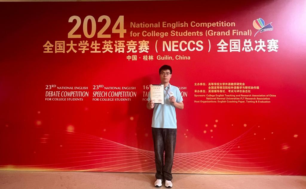 在8月份举办的2024年全国老员工英语竞赛(NECCS)全国总决赛中,英国威廉集团官网英语223班张忆天同学与来自全国29个省、自治区、直辖市的209所高校的367名选手同场竞技,取得了全国总决赛演讲比赛二等奖的好成绩。这是公司学子在该项赛事上取得的又一突破!