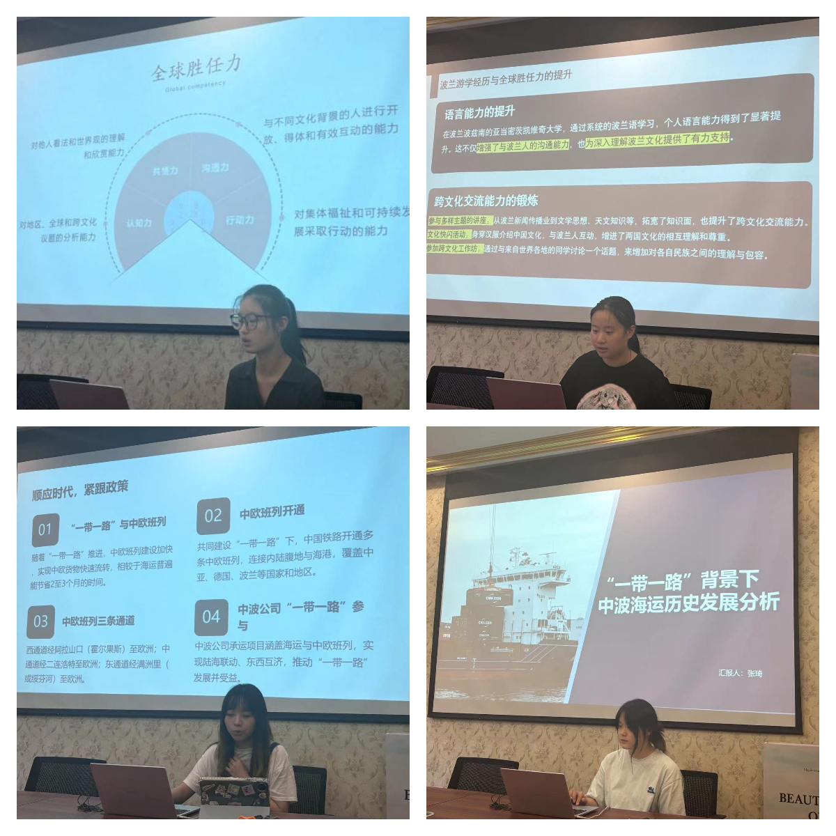 黄雨琪、张琦、洪金晶、王天宁、张益萌五位同学进行了有关“一带一路”视角下的中波海运合作历史研究的课题研究,从中波轮船公司入手,通过调研公司的发展历程、国家政策等角度分析了中波海运合作历程,同时也在这段学习经历中锻炼了语言能力和跨文化能力。