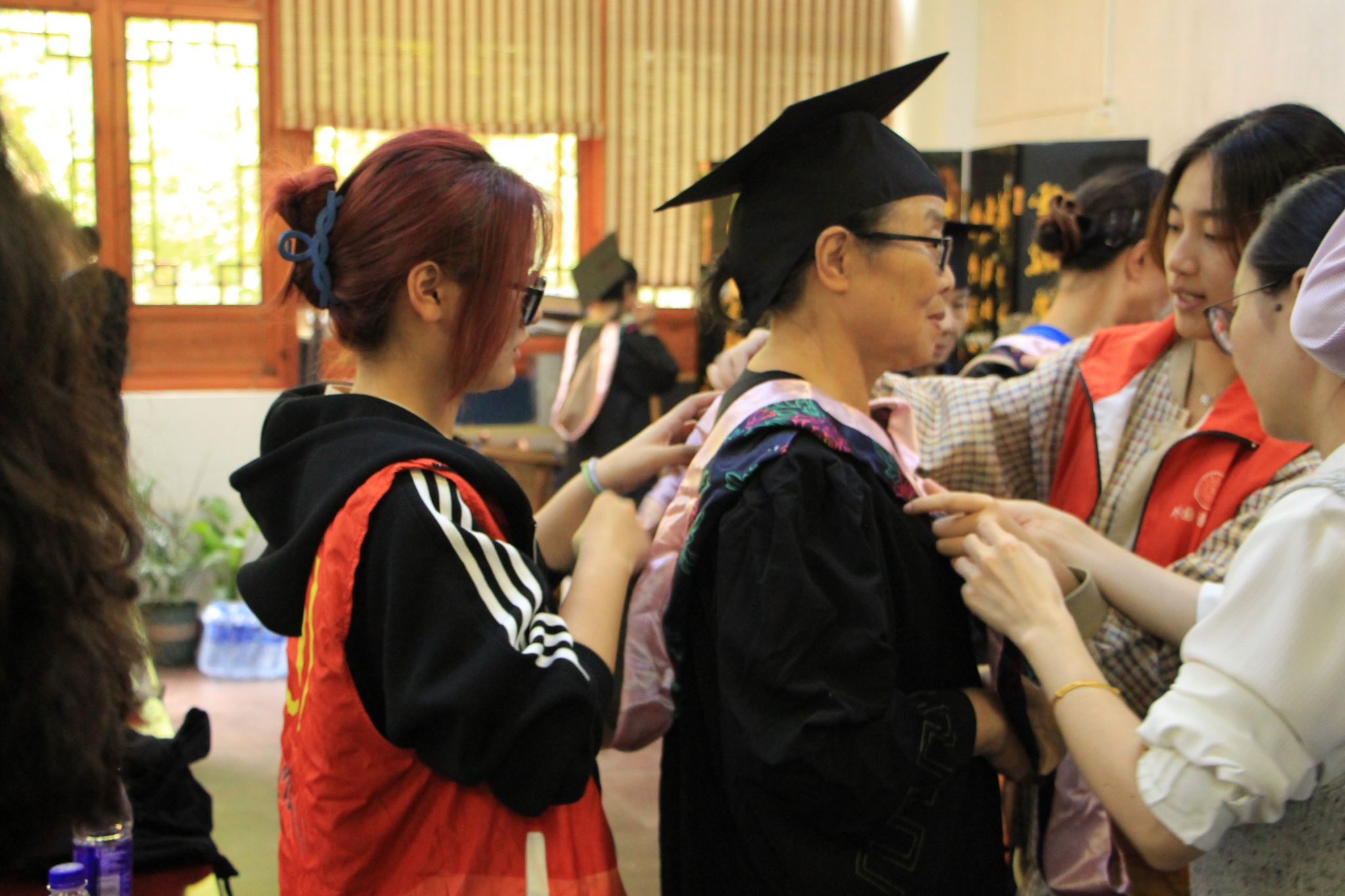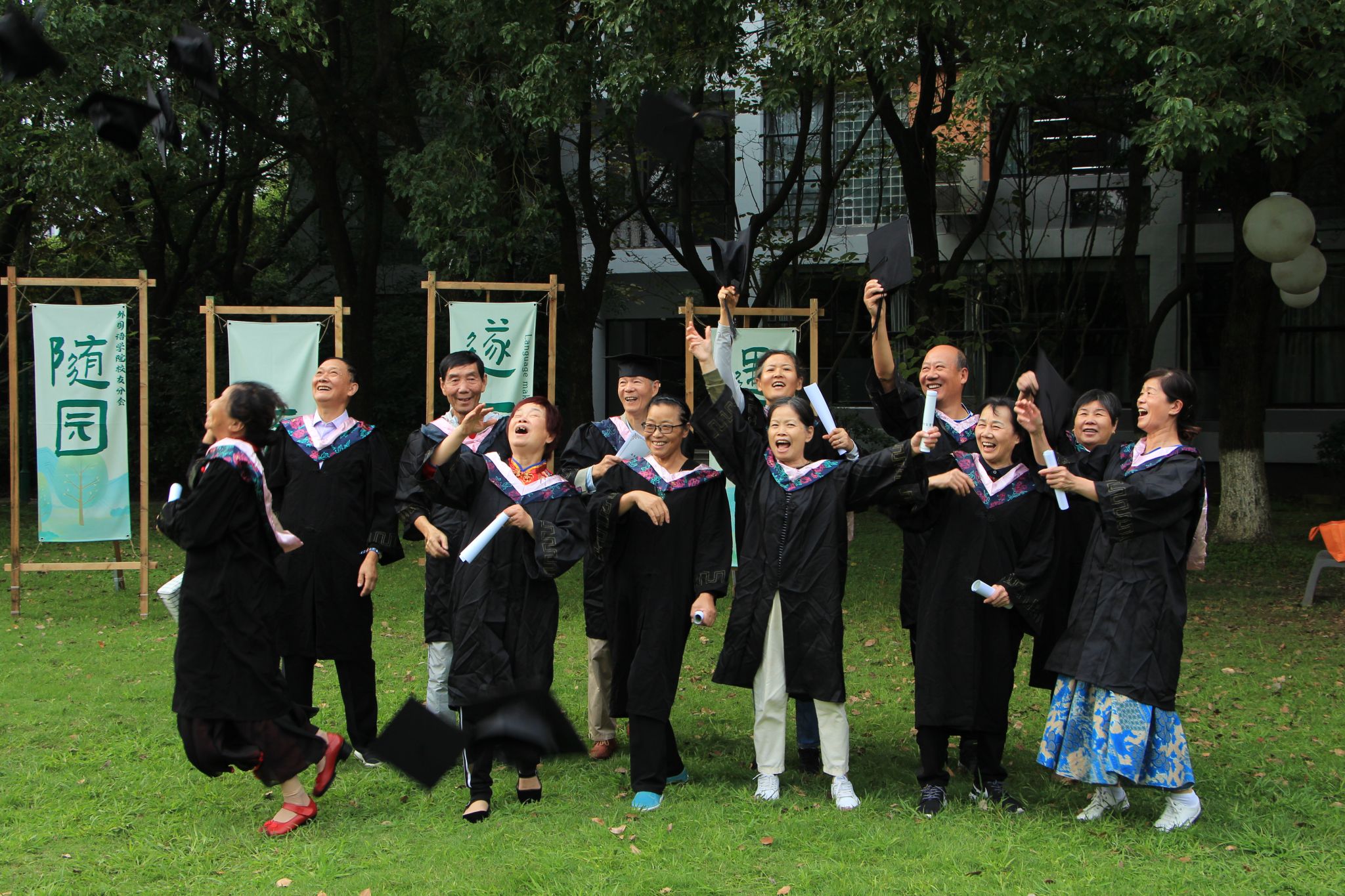值得一提的是,志愿者们还偷偷给老人们准备了一个惊喜——穿上学士服,体验大学毕业。老人们换上了崭新的学士服,戴上了学士帽,仿佛真的成为了刚刚毕业的学子。他们相互给对方整理衣领和帽子,脸上洋溢着幸福和自豪的笑容。最后的照片里,每一张都记录着他们与大公司园的亲密接触和美好回忆。老人们纷纷表示,这是他们人生中第一次穿上学士服拍照,非常新奇和激动。