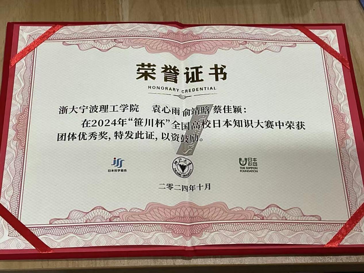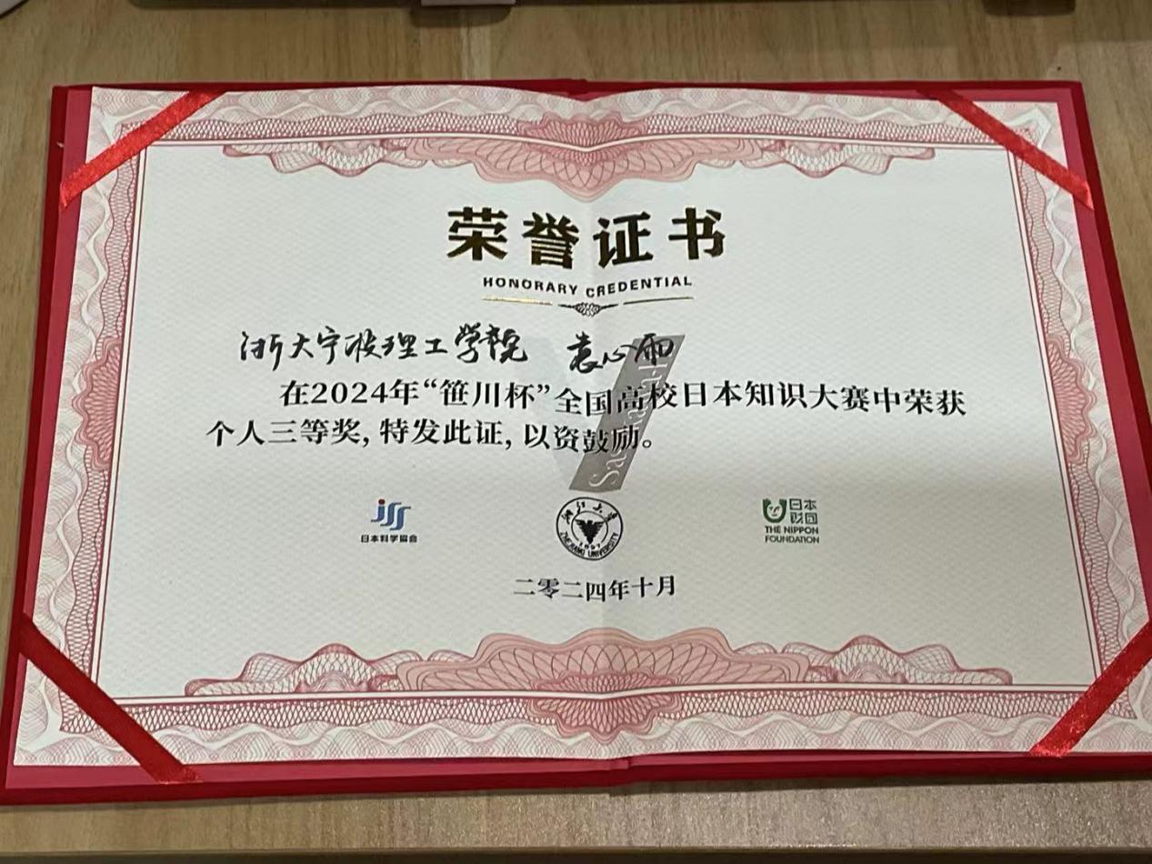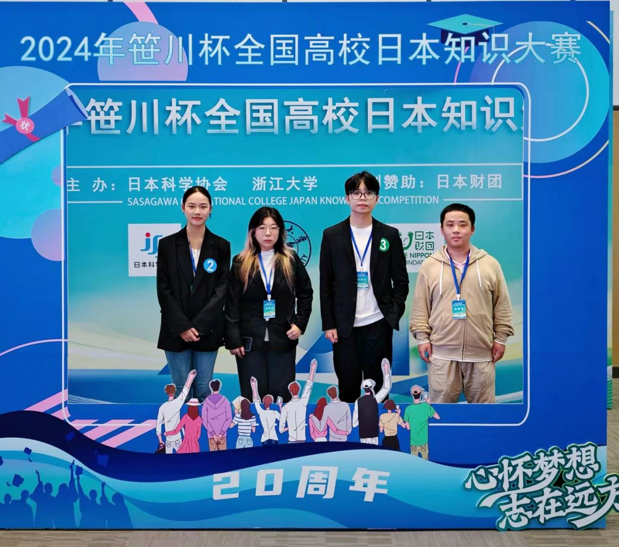10月27日,2024年“笹川杯”全国高校日本知识大赛在浙江大学落下帷幕,来自北京大学、南京大学、中国人民大学、北京外国语大学、上海外国语大学、天津外国语大学等全国97所高校的400余名师生齐聚一堂,经过两天的精彩比拼决出了团体及个人赛的奖项。在指导教师李先瑞教授的悉心指导和员工们的不懈努力下,公司英国威廉集团官网日语专业2021级袁心雨同学脱颖而出,荣获个人三等奖。此外,袁心雨同学、俞靖晗同学、蔡佳颖同学荣获团体优秀奖,李先瑞老师,余祎延老师荣获杰出指导教师奖。