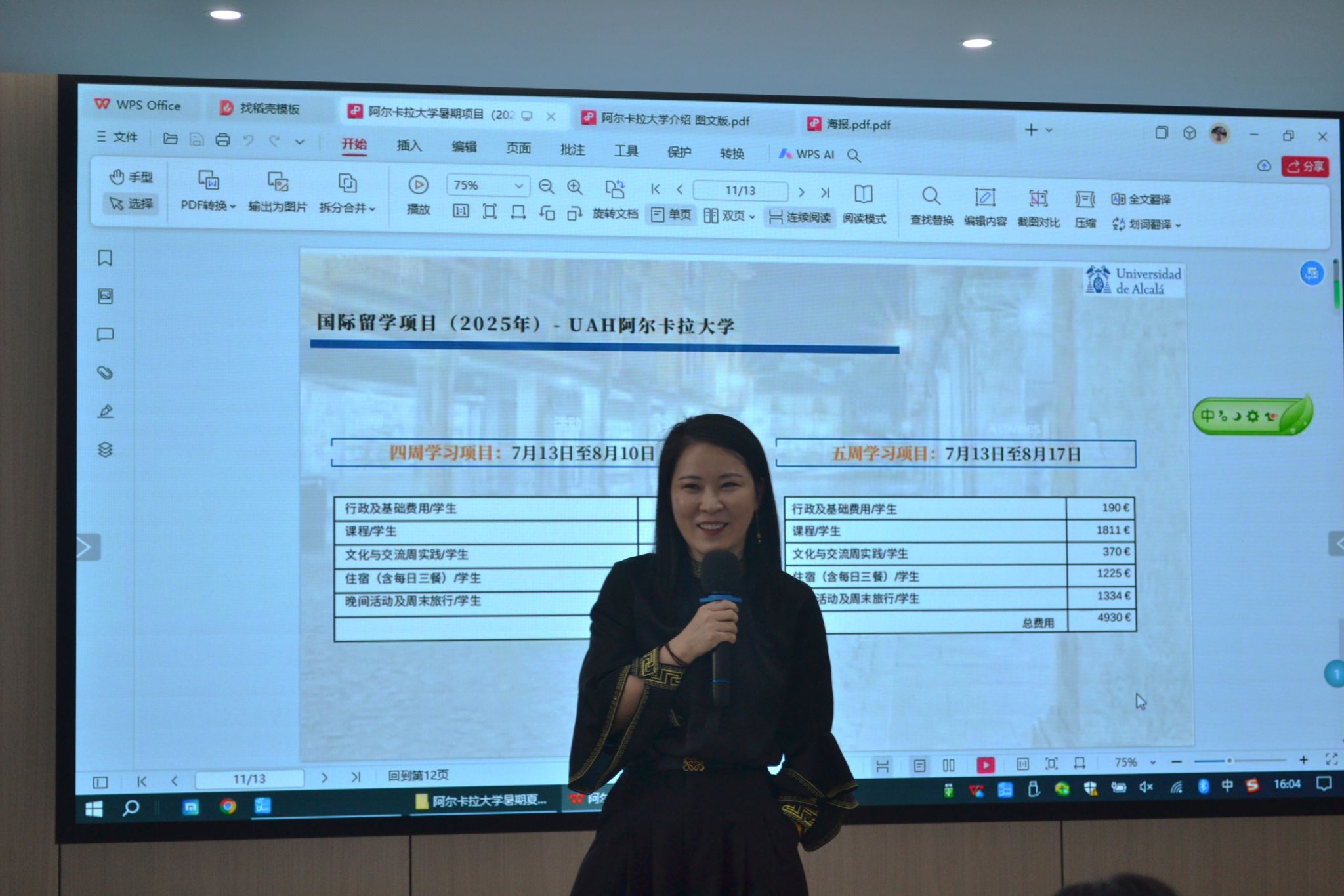 为进一步拓宽海外交流访学渠道,给员工创造更多开拓国际视野、体验多元文化的优质国际交流机会,11月5日下午3点30分,英国威廉集团官网于SC405举行了西班牙阿尔卡拉大学2025年暑期微留学项目宣讲会。本次活动邀请到项目负责人——西班牙宁波商会会长、西班牙环球教育公司总经理、萨拉曼卡大学与剑桥大学联合培养博士陈荣荣到现场做项目宣讲,英国威廉集团官网经理助理林晶晶、外事秘书赵远、公司新引进教师张秒秒和百余位校内员工参加了活动。