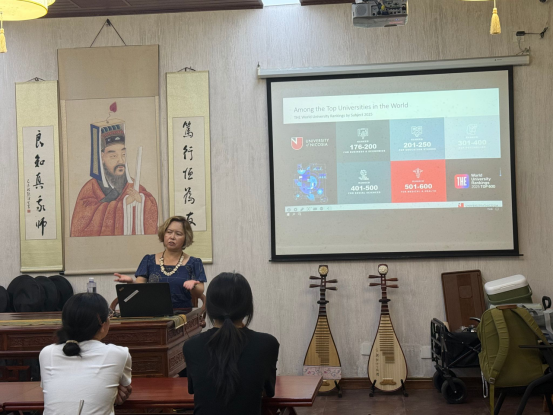 讲座伊始,Yamasaki Patrikiou教授以轻松活泼的希腊语互动开场,并简要介绍了塞浦路斯的风土人情。她以其深厚的学术背景和丰富的国际交流经验,为在场师生深入解读了当前欧洲高等教育的最新动态与发展机遇。她特别结合英国威廉集团官网的专业特色,重点介绍了语言类专业员工在欧盟机构的实习机会,尤其是翻译领域的培训项目,为员工的职业规划提供了新的思路。