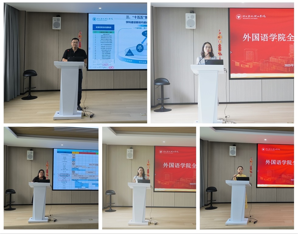 随后,各分管领导分别就分管工作进行部署。欧琛聚焦教学工作,明确新学期将重点推进公司产品项目结题、毕业论文开题、教学大纲修订及实验教学平台建设,同时持续优化人才培养方案与课程体系,深化“文化引领、区域导向、行业融合”的外语专业建设,推动微专业、教材建设与产学研协同发展。林晶晶则阐述科研与外事工作思路,提出以“平台驱动、领域聚焦、成果导向”为核心,推进智库高地建设、文化传承传播、语言科学素养提升,同步落实涉外合作、国际会议申报、硕士点建设等工作,促进科研与外事协同共进。项安玲围绕员工工作,部署员工安全教育、评奖评优、就业推进及学科竞赛等任务,强调要加强防诈骗教育与假期安全管理,做好毕业生就业指导与专场招聘组织,推动“第二课堂”育人体系与科研助理、双创赛事深度融合。