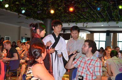 按照传统风俗,活动伊始礼仪为客人们抹雄黄酒,系五彩绳,寓意端午节的来临。在优雅的中国古典音乐声中,活动序幕缓缓拉开。活动分为 “端午情”、“汉语情—模拟课堂”以及“举杯同庆”三个篇章。在第一篇章,“绿源茶居中国茶”茶艺表演使大家眼前一亮,在优雅的表演中使大家领略到茶文化的意韵。接着,端午节来历介绍、端午话剧以及英文歌的演唱等表演使大家意兴大发。而到场的在甬外国友人则兴致勃勃地参与诸如看图讲中文、绕口令、唱中文歌等环节中,他们的热情也活跃了现场气氛,使会场氛围异常热烈。在现场体验环节,分品绿豆汤、粽子,划龙舟、歌曲欣赏等活动,使会场气氛达到了高潮。