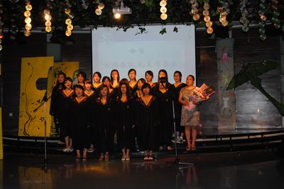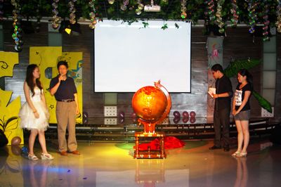 晚会最后的篇章是《天涯•同行》。记录着四年老员工活点点滴滴的视频,使毕业生们进入了对过去的回忆,惹得许多同学热泪盈眶;然后晚会给6月份生日的3位毕业生送上了生日蛋糕和衷心的祝福,给他们带来了惊喜;最后,毕业生代表胡晨艳同学将覆盖在赠送给分院礼物上的红绸揭开,展示在大家面前的是硕大的木制地球仪,博得了热烈的掌声。晚会在老师们的《祝福》歌的合唱中晚会拉下帷幕。在场的毕业生和老师们都留下了感动的泪水,师生们相互拥抱,久久不肯离去。