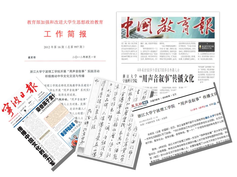【用声音叙事】近5年以来,公司专业教师带领400余位英、日语专业员工开展了 “用声音叙事”大型专业实践活动。师生们调研、走访了近 50个国家的700余位在甬外籍人士,撰写了《用声音叙事——筑梦宁波》和《用声音叙事——我的企业在宁波》(浙江大学出版社)2部中英(日)文双语著作。活动得到了省、市主要领导的批示肯定和教育部《教育信息》登载,获得了国内重要报纸和著名网站的广泛报道。www.huaue.com/dlxy/20111229165817.htm